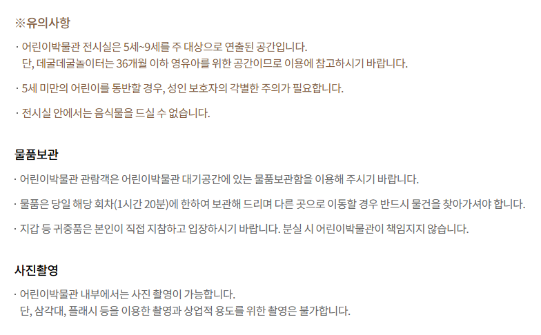 어린이박물관은 실내 시설이지만, 입장 대기와 이동 구간은 야외 동선이 포함돼요.