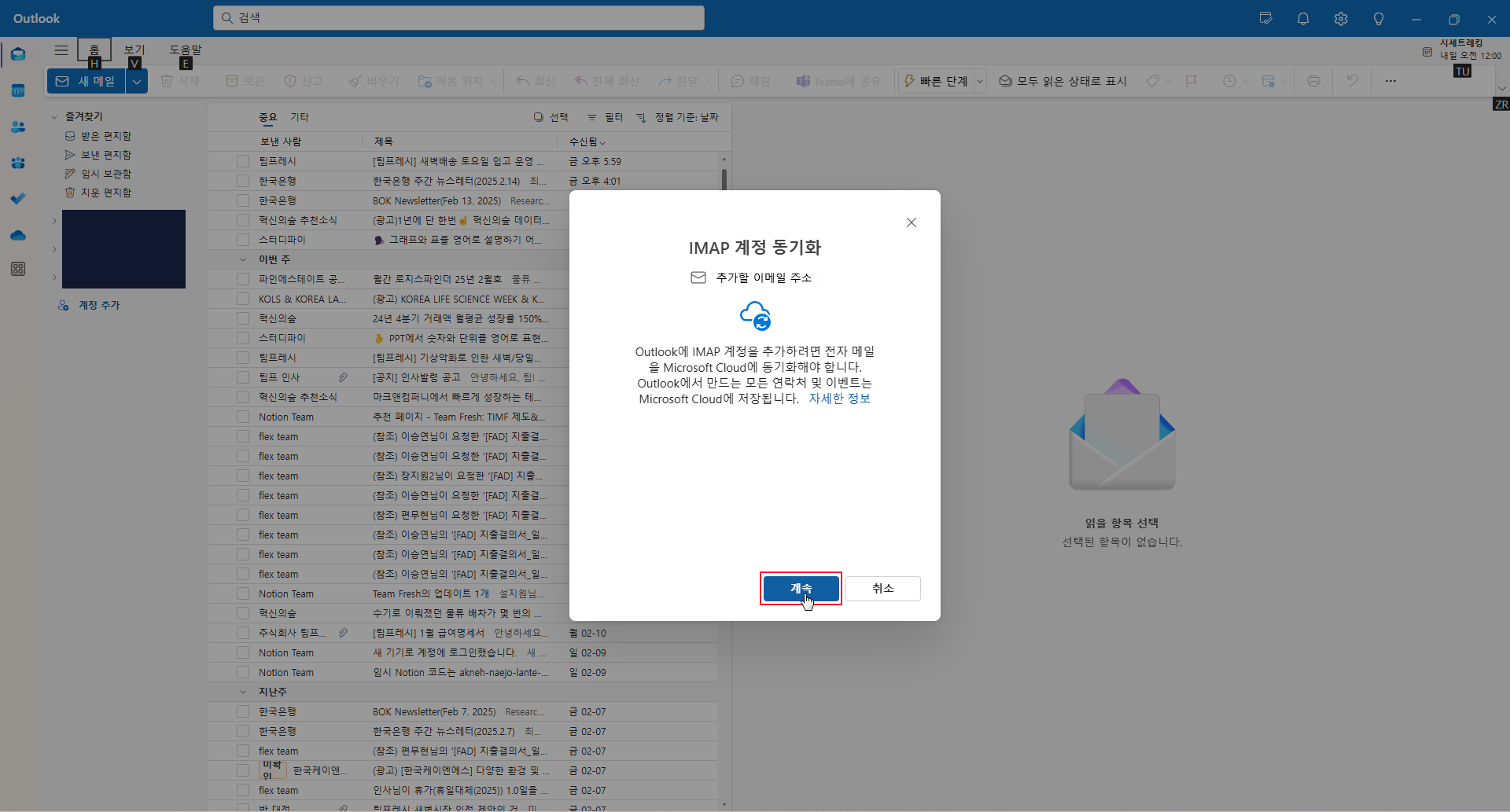 IMAP을 사용 중이라면 아웃룩에서 제거해도 서버에 메일이 남아있지만, POP3로 설정한 경우 메일이 삭제될 수 있으니 주의하세요.