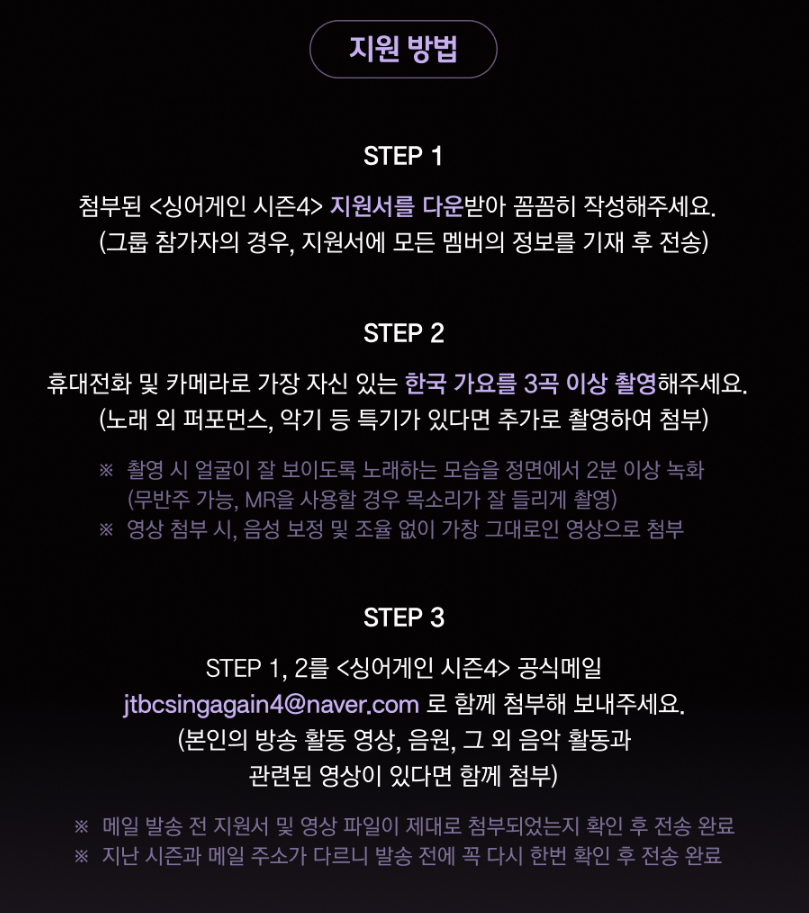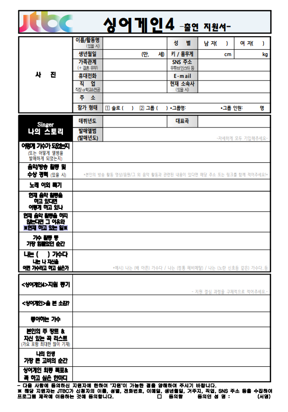 - 지원서 다운로드: 싱어게인4 공식 홈페이지에서 다운로드