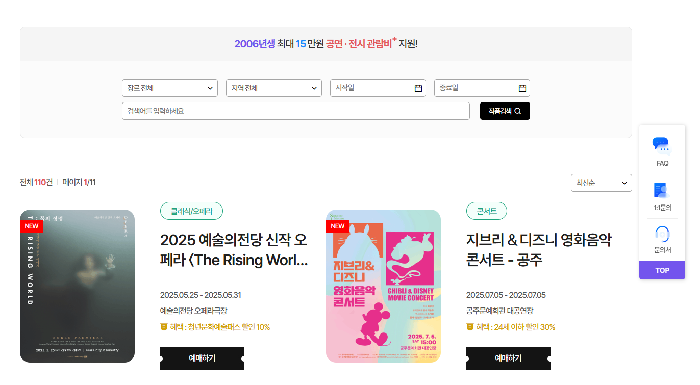 이 패스를 이용하면 연극, 뮤지컬, 콘서트, 미술 전시 등 다양한 문화예술을 부담 없이 즐길 수 있습니다. 특히 인터파크, YES24 같은 협력 예매처를 통해 쉽게 예매할 수 있다는 점도 장점입니다.
