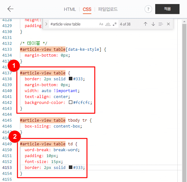 이제 아래 표 스타일 코드를 복사하여 기존 코드와 교체합니다. 이미지에 있는 번호대로 알맞게 진행합니다.