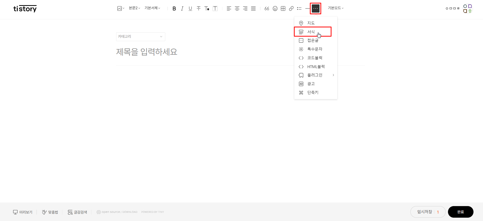 FAQ 또는 Q&A를 작성하실 때, 우측 상단에 점 세 개를 클릭하여 "서식"을 클릭합니다.