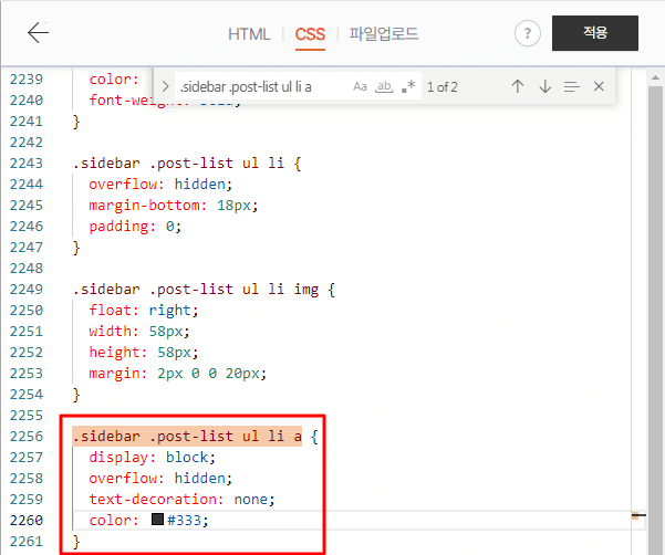 CSS 파일 내에서 아무 곳이나 클릭한 후, Ctrl+F를 눌러 검색창에 '.sidebar .post-list ul li a'를 입력합니다. 보통 2256번째 줄에 있습니다.