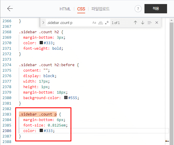 CSS 파일 내에서 아무 곳이나 클릭한 후, Ctrl+F를 눌러 검색창에 '.sidebar .count p'를 입력합니다. 보통 2383번째 줄에 있습니다.