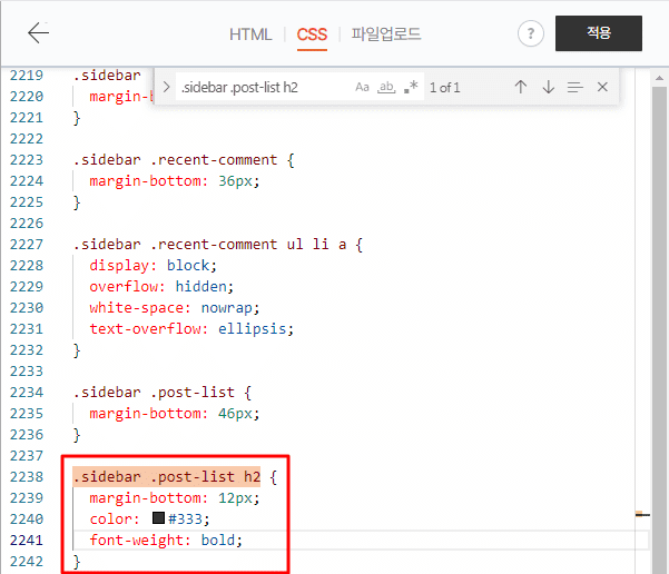 CSS 파일 내에서 아무 곳이나 클릭한 후, Ctrl+F를 눌러 검색창에 '.sidebar .post-list h2'를 입력합니다. 보통 2238번째 줄에 있습니다.