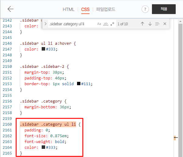 CSS 파일 내에서 아무 곳이나 클릭한 후, Ctrl+F를 눌러 검색창에 '.sidebar .category ui li'를 입력합니다. 보통 2160번째 줄에 있습니다.