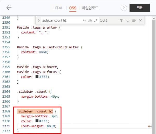 CSS 파일 내에서 아무 곳이나 클릭한 후, Ctrl+F를 눌러 검색창에 '.sidebar .count h2'를 입력합니다. 보통 2256번째 줄에 있습니다.