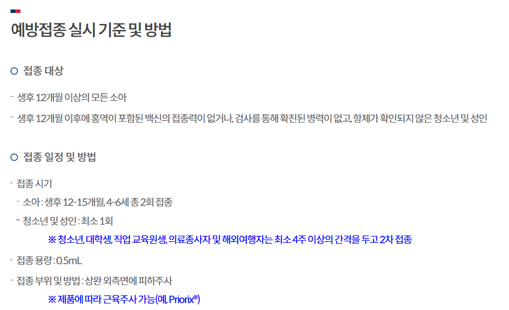 • 청소년(13~18세): 예방접종 기록이 없거나 2차 접종 여부가 불확실한 경우, 항체 검사를 받은 후 필요하면 추가 접종